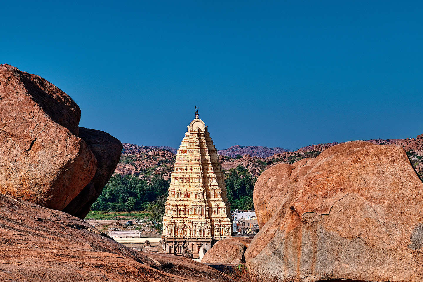 A view of Virupaksha temple from the Hemakuta Hill in Hampi. The Virupaksha temple is the oldest shrine, the principal destination for pilgrims and tourists, and remains an active Hindu worship site.
