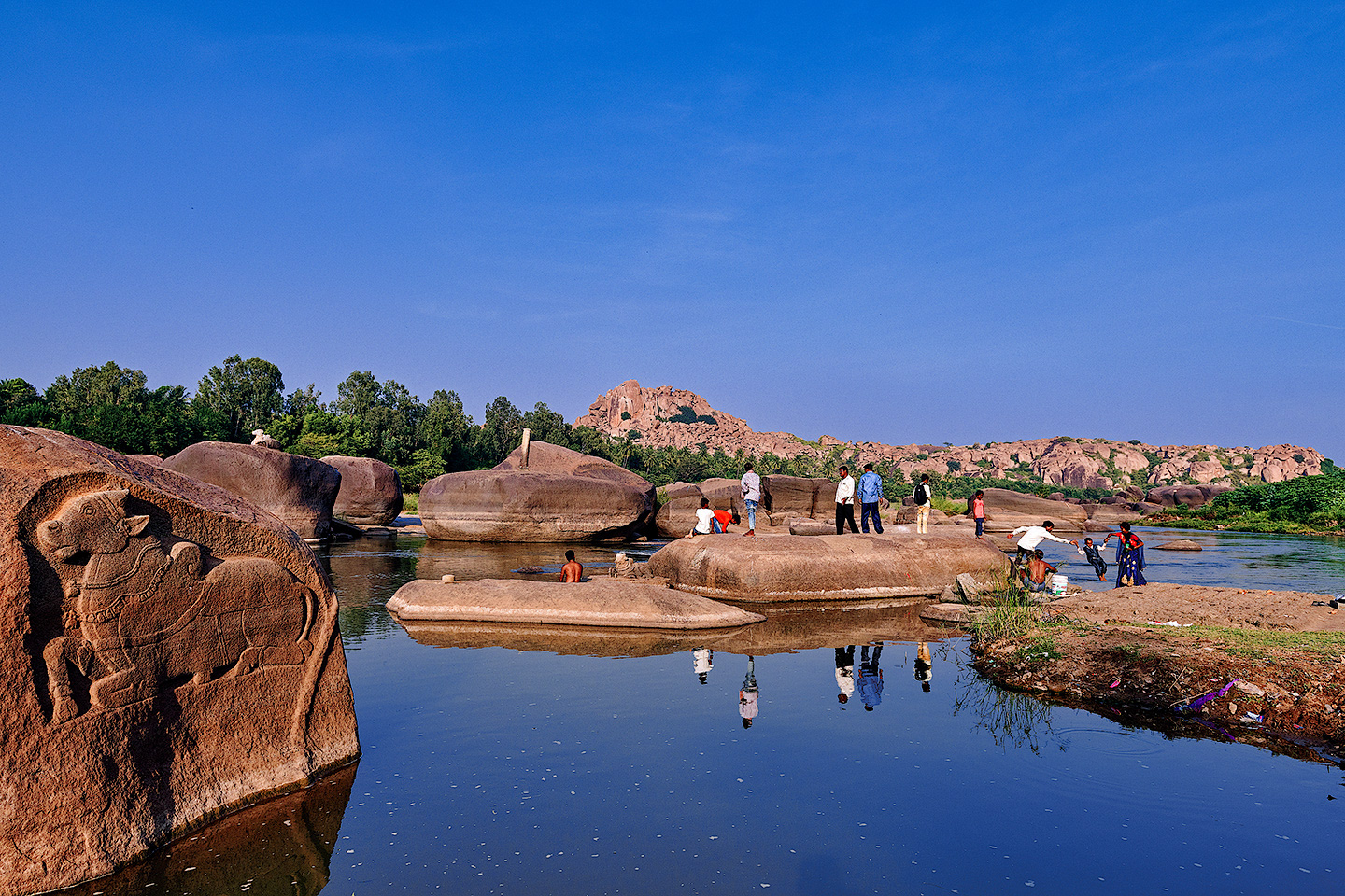 Tourists at the bank of Tungabhadra River in Hampi, Karnataka, India.