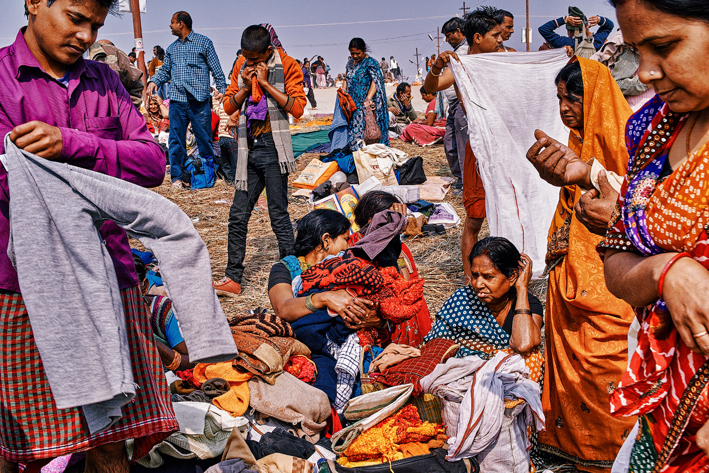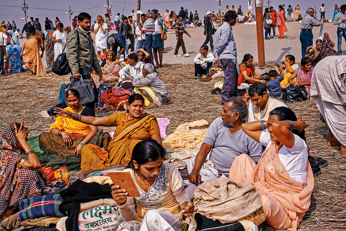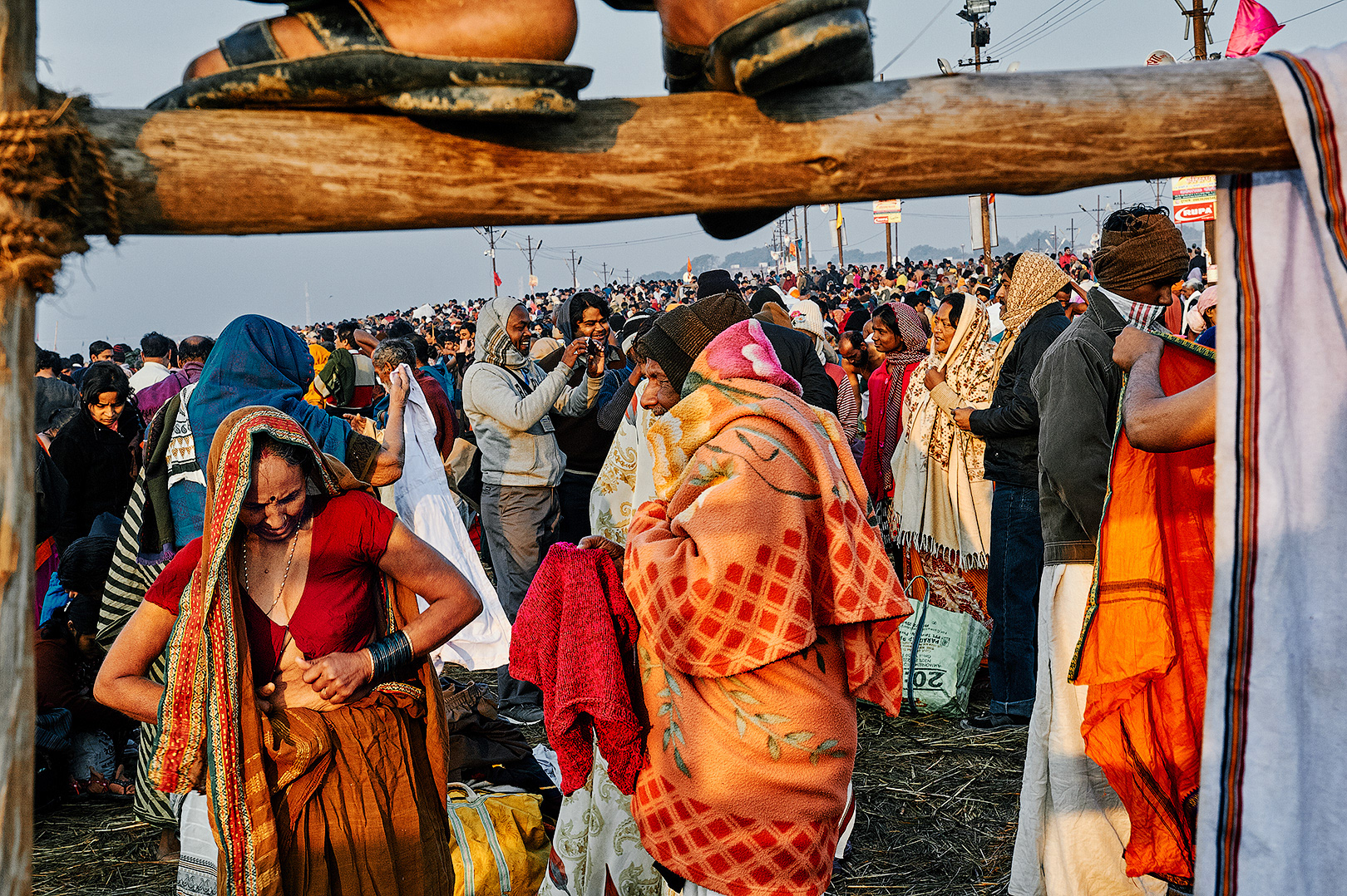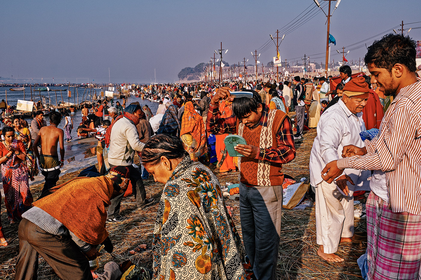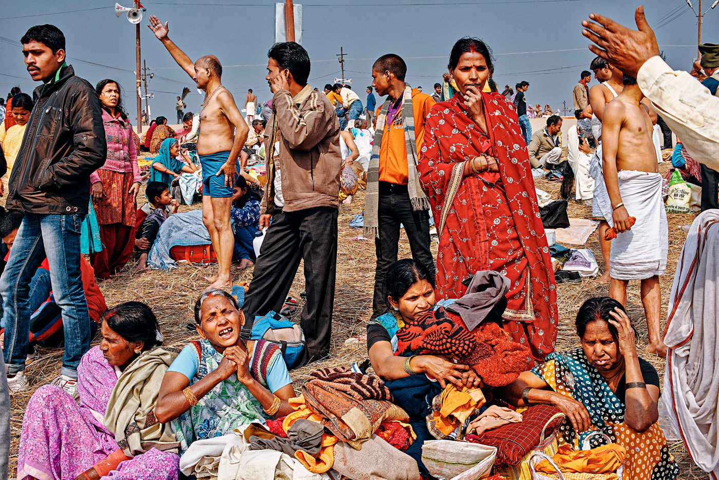 Gathering of people near the Triveni Sangam, where three rivers (Ganga, Yamuna and Saraswati) merge into one, on one of the main bathing dates (Paush Purnima) during the Kumbh Mela in Allahabad, Uttar Pradesh.